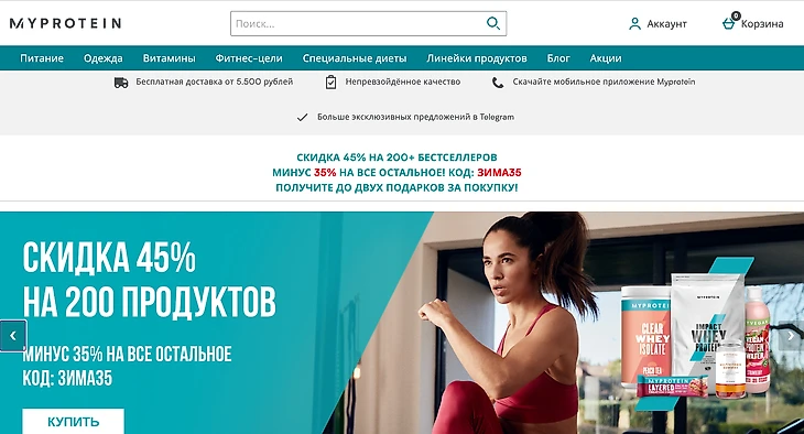 Сейчас в магазине Myprotein.ru проходит акция! Скидка 45% на 200 продуктов и 35% на все остальное по протоколу: ЗИМА35
