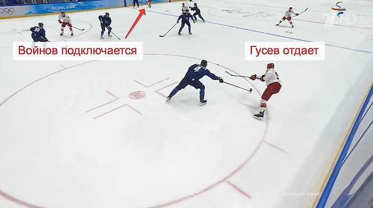 Другой полувариант нашей сборной в атаке – подключения защитников, их использовали звенья Шипачева и Гусева, выглядело это примерно вот так.