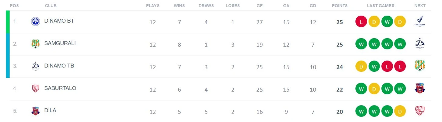 По спортивной составляющей, текущий сезон чемпионата Грузии получается очень интересным. Прошла уже треть сезона (всего 4 круга по 9 матчей), а плотность в таблице очень высокая. В следующем туре у Динамо Батуми появится шанс поправить настроение и вернуться на победный путь, так как соперником будет один из аутсайдеров чемпионата - клуб Самтредиа. Второе же и третье места будут играть друг с другом. Но не стоит сбрасывать со счетов и Дилу, и Сабуртало.