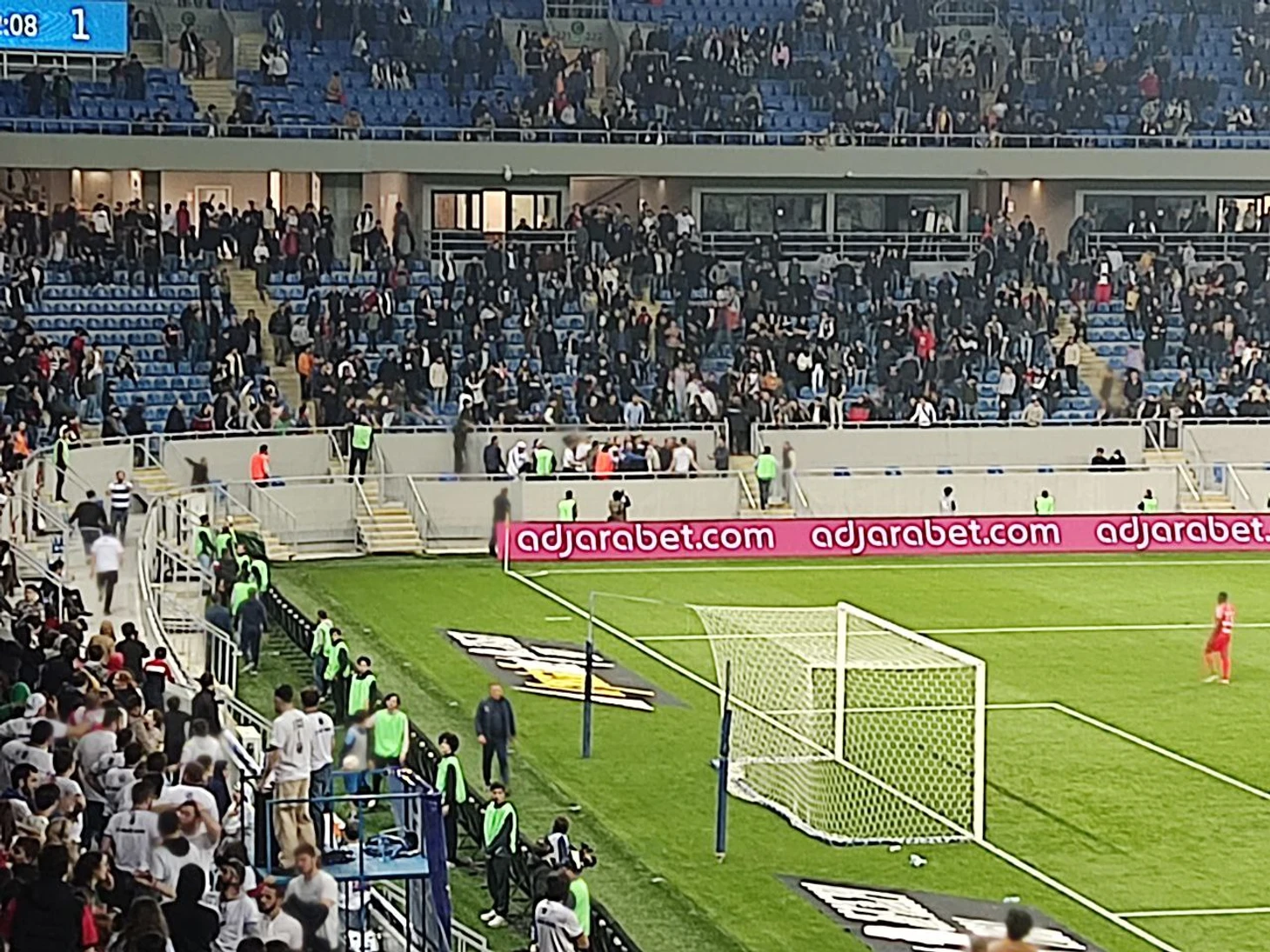 После этого заведенные случившимся болельщики остро реагировали на каждое спорное решение судьи, а напряженность атмосферы передалась футболистам. Игрок Динамо грубовато, но в рамках правил, у боковой на против скамеек запасных встретил соперника, за что тут же был откровенно борцовским приемом опрокинут на газон другим футболистом Дилы. Тут же подскачили все запасные обоих клубов, собралась толпа, а с трибуным полетели пластиковые бутылки. К чести хозяев, они сразу пошли успокаивать болельщиков. Если правильно запомнил, то первым это начал делать Гурам Гиорбелидзе, правый крайний защитник, вышедший на замену.