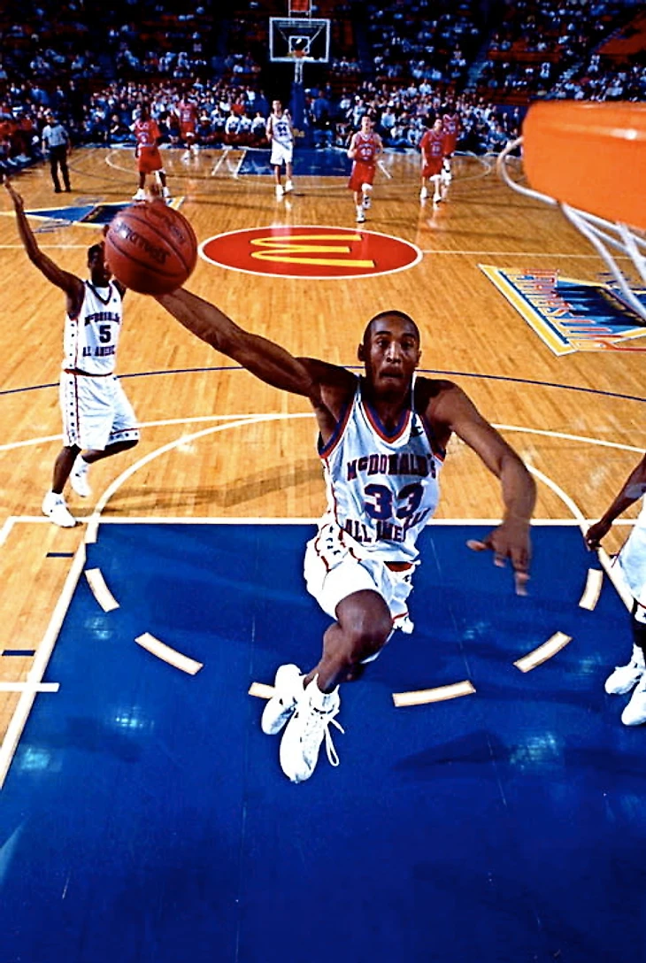 Одним из первых появлений Кобе, доминирующего на мяче, оказался матч новичков. Ему было важно показать себя на фоне остальных. Айверсон тогда набрал 19 очков, Антуан Уокер – 20, Кобе постарался на 31 в своем типичном стиле – 8 из 17 с игры, 16 выходов на линию штрафных, 7 потерь. Конкурс по броскам сверху – история из той же серии.
