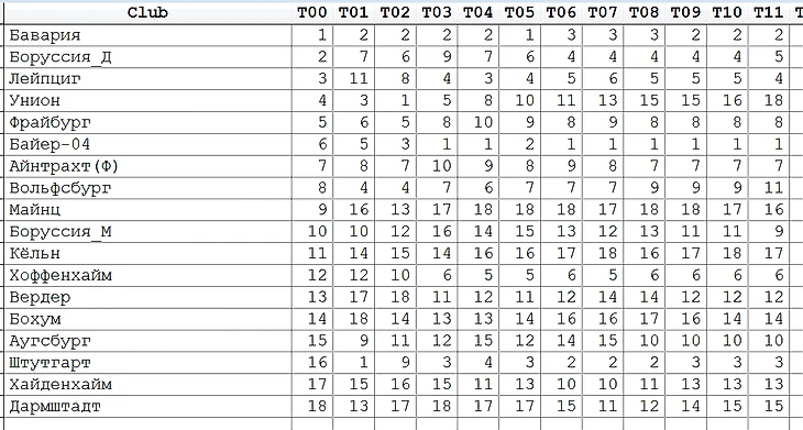 Стабильны Вольфсбурга(8->11), Айнтрахт(7->7), Боруссия М(10->9)