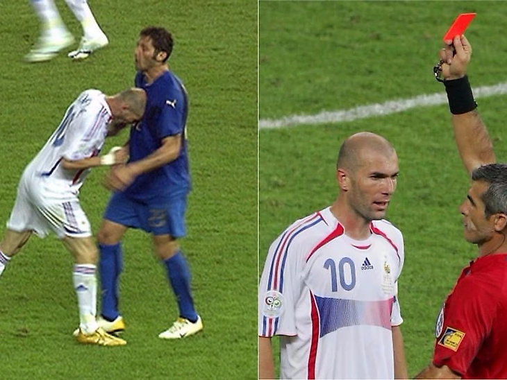 Зидан забил с пенальти и в финальном матче против сборной Италии, но тот матч был омрачен тем самым известным удалением за удар Марко Матерацци. Зизу грубо ответил на слова Матерацци, ударив его головой в грудь, после чего был удален с поля. В серии послематчевых пенальти итальянцы одержали победу. Зидан - четвертый футболист в истории после бразильцев Пеле, Вава и немца Пауля Брайтнера, кому удавалось забивать в двух финальных матчах чемпионатов мира. «Я не горжусь, что ударил Матерацци. Я уже извинялся перед молодежью, тренерами, всеми, кто старается изменить футбол к лучшему. Но это часть моей карьеры, моей жизни. Это одна из неприятных вещей, которую нужно просто принять и пережить», - отмечал Зидан. Позже он рассказал, что ударил Матерацци за оскорбление своей сестры.