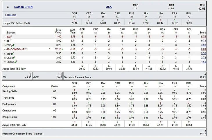 Мы видим, что итальянка Пинуччия Феррарио и японка Ритсоко Хориучи выставляют Нейтану неправомерные оценки за представление и интерпретацию музыки. Синьора Феррарио добавила некорректную оценку за навыки катания, а Хориучи-сан - за композицию. Они были отброшены как самые высокие, но это не отменяет нарушения правил.