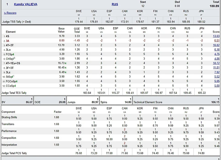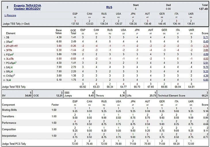Здесь мы видим, что неправомерные оценки ставили Эмили Биллоу (Швеция, интерпретация музыки), Даниэль Делфа (Испания, перформанс, композиция, интерпретация музыки), Уэй Ши (Китай, интерпретация музыки) и Елена Фомина (Россия, перформанс). Впрочем, они могли счесть ошибку Валиевой не нарушающей рисунка программы: у нее был довольно мягкий степ-аут, который можно посчитать всего лишь за слишком короткий выезд. Все в глазах смотрящего, как говорится.