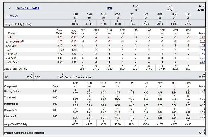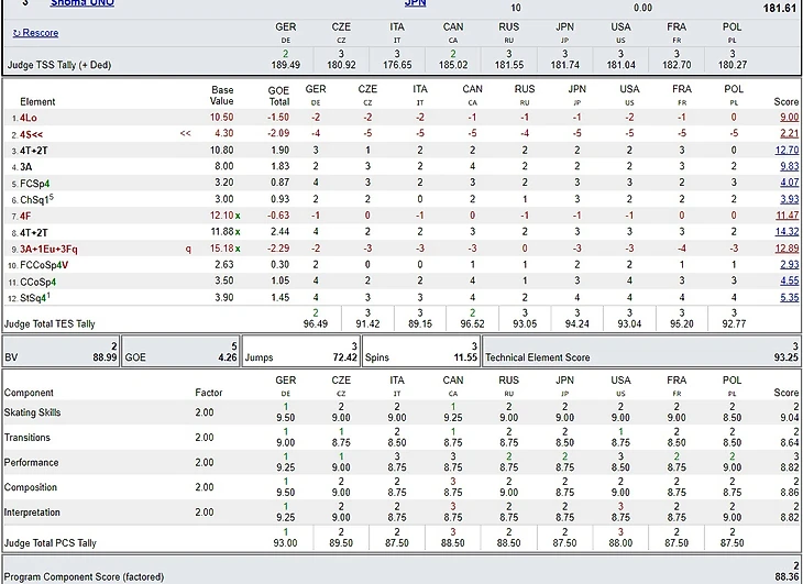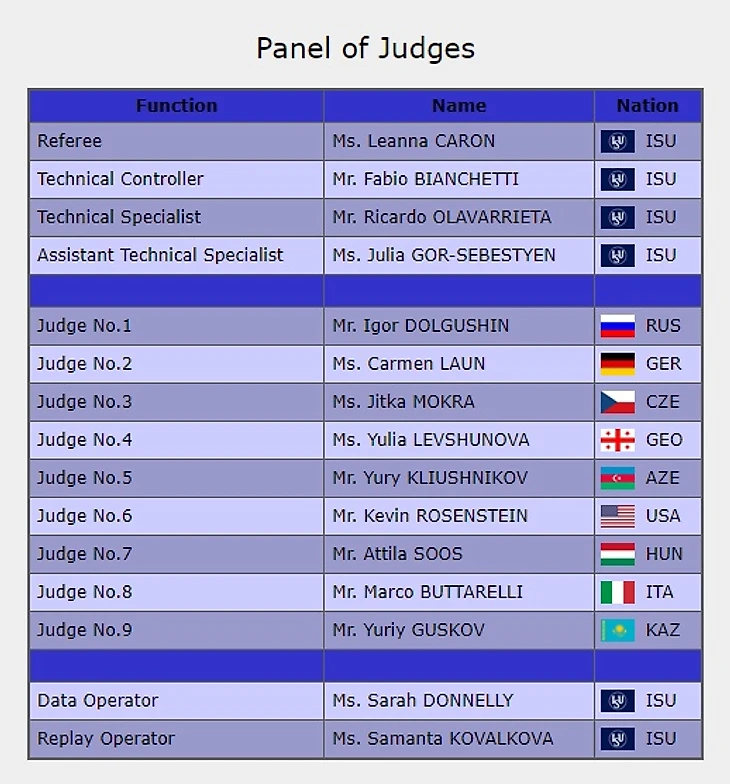 Здесь неправомерные оценки поставили судьи из Германии (Улла Файг, в целом по своей истории судейства довольно любит японских фигуристов, к примеру, на NHK Trophy-2018 фрау Файг довольно ощутимо утопила Туктамышеву в пользу Кихиры и Мияхары - впрочем, это не относится к делу, а вот тот факт, что у Файг четыре оценки из пяти противоречат правилам, к делу относится), Чехии (Мирослав Минурец) и Польши (Мальгоржета Собков).