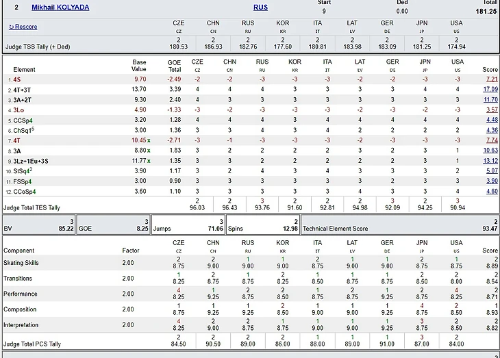 Оба поставили Михаилу 9.25 за интерпретацию музыки. Фрау Лаун добавила 9.00 за перформанс. Как мы видели выше, эти оценки являются нарушением правил, написанных ISU.