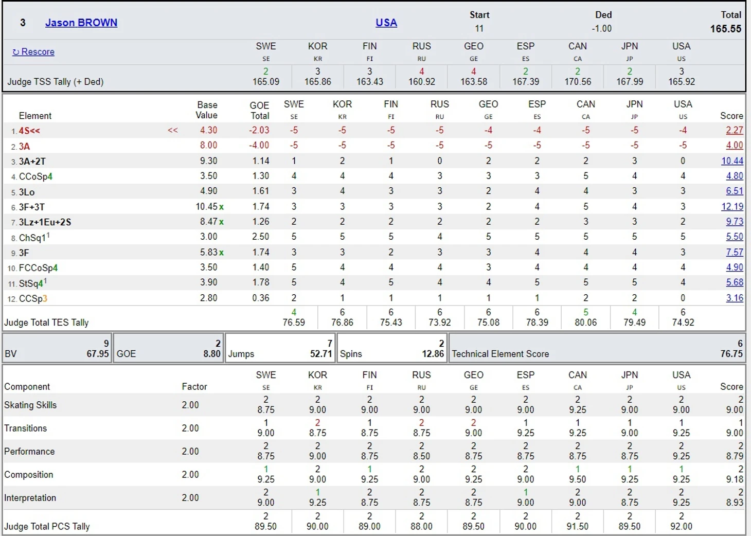 У Джейсона Брауна в произвольной программе было падение с тройного акселя и четверной сальхов. То, что он недокручен, не должно влиять на компонентные оценки, а вот тот факт, что он был на две ноги с потерей скорости и заметным спотыком - должен. Итого две грубые ошибки (двойной сальхов вместо тройного в ойлерном каскаде я к ним не отношу).