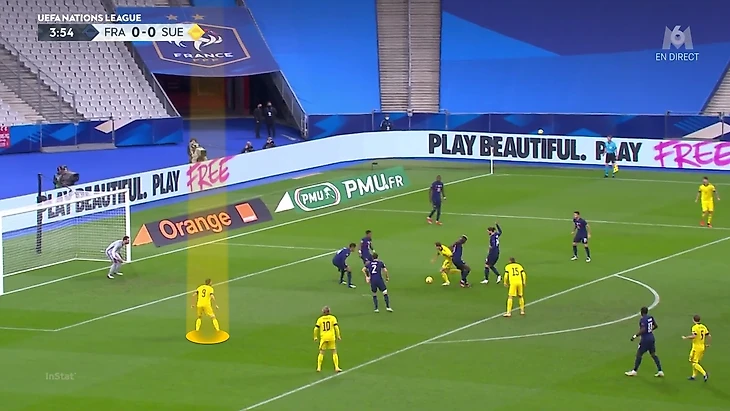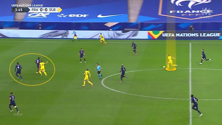 Второй пример – из игры с Францией. Снова в главной роли Берг. Маркус опять блокирует двух защитников и создает пространство для рывка Классона вперед (заодно показывает ему на свободного партнера справа):