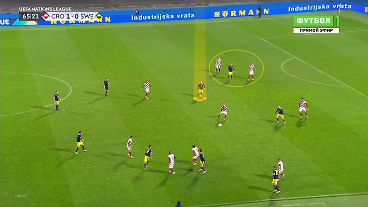 Матч с Хорватией. Берг специально не стягивается к мячу – вместо этого пятится назад и блокирует сразу двух защитников. Благодаря этому Форсберг остается без опеки и может сделать рывок в штрафную: