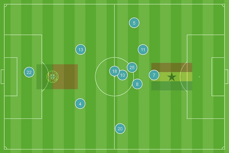 Перед первым голом Ганы: Бернарду и вышедший на замену Карвалью опекают одного игрока, пока в опорной открывается соперник: