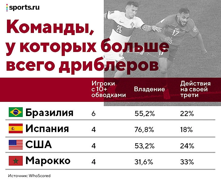 Техническое оснащение марокканцев подсвечивает их место рядом с Бразилией и Испанией по количеству дриблеров в команде.
