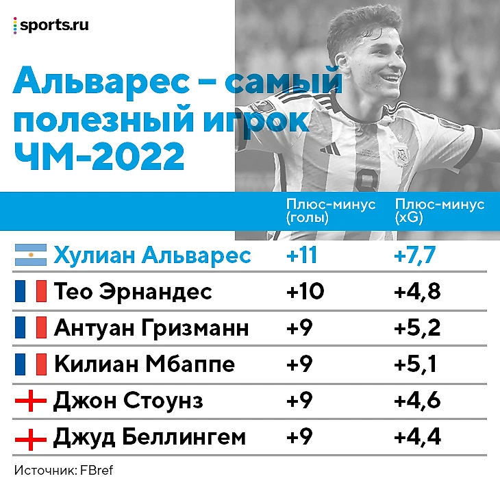 Шок, но с Хулианом на поле Аргентина еще не пропускала: Саудовская Аравия забила оба мяча до его выхода на замену, а Нидерланды и Австралия, когда он уже покинул поле. По хоккейной системе «плюс/минус» Альварес лидирует на ЧМ. Выборка маловата, но верифицирует лидерство разница ожидаемых голов.