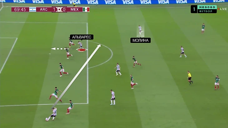 Располагаясь строго между двумя защитниками, Альварес напрямую помогает Лео творить. Тут освободил пространство для прохода: