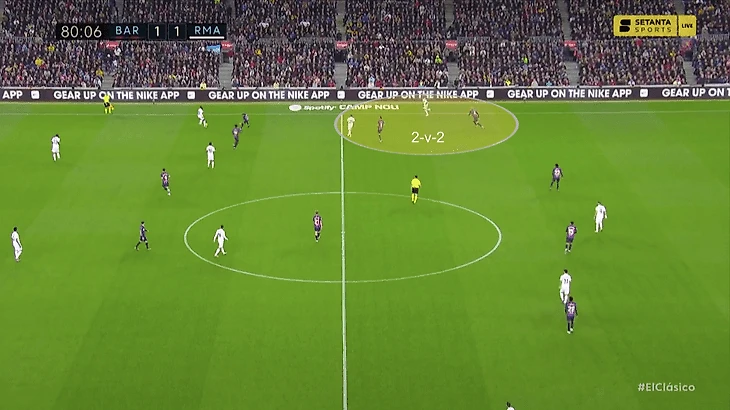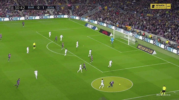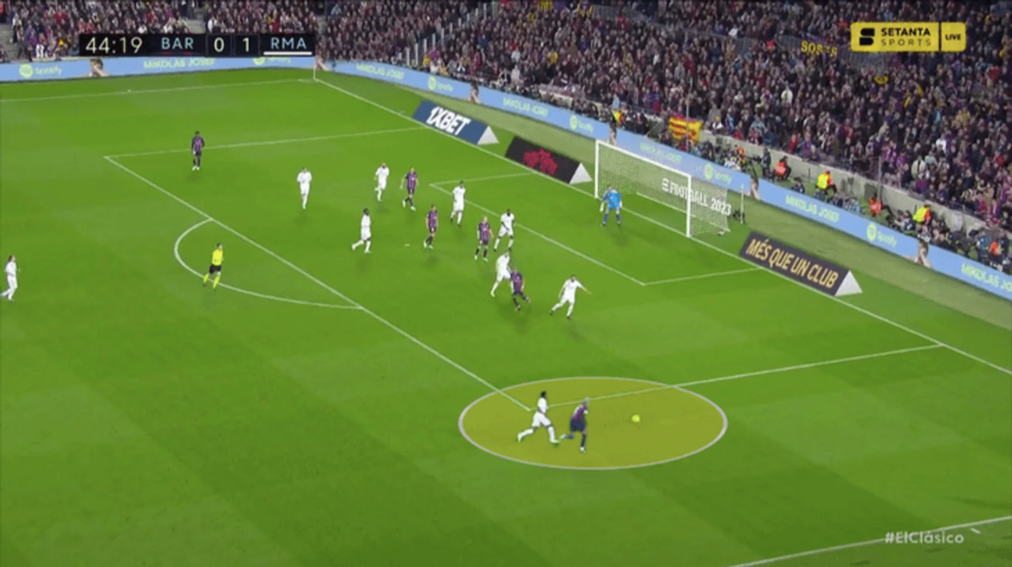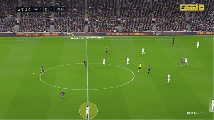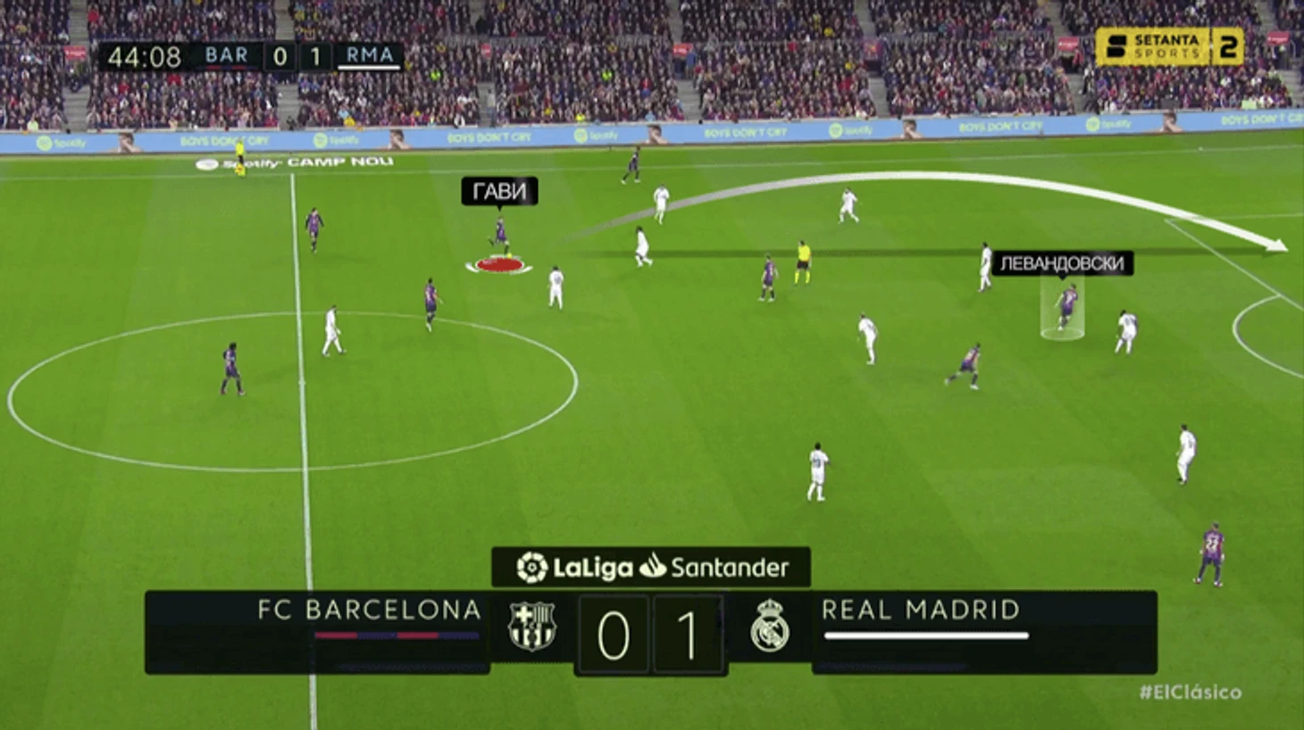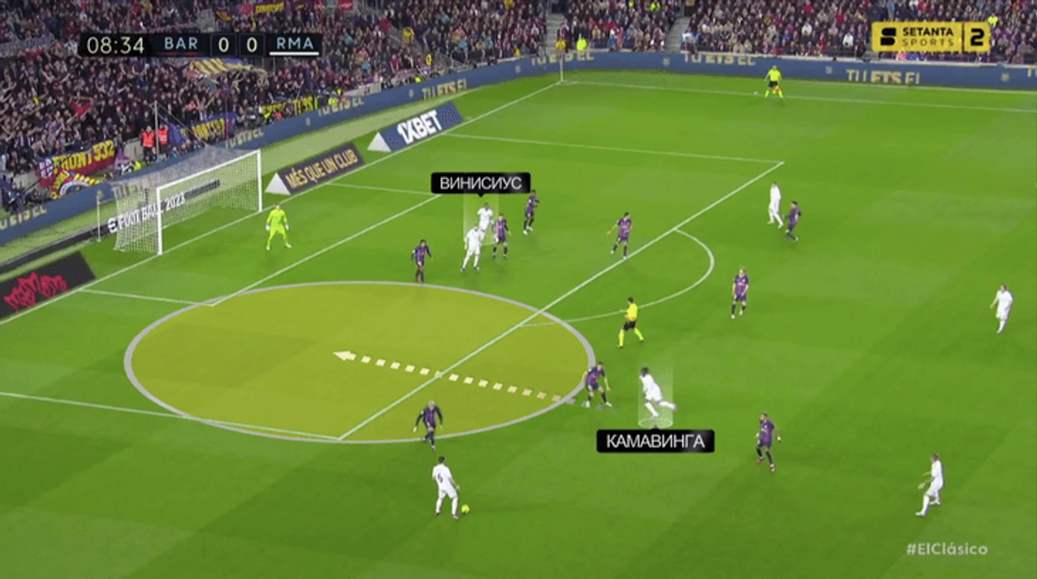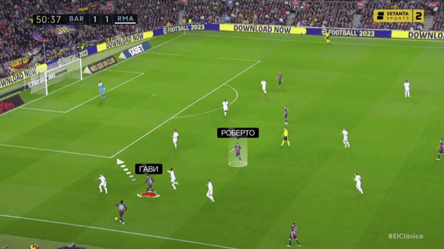 Разменной монетой стала открытость «Мадрида». Вместо четверки хавбеков за центр поля теперь отвечала только пара Себальос – Тчуамени. Атакующая группа тоже почти не возвращалась назад – «Барса» могла наказывать в контратаках.