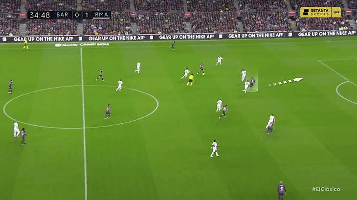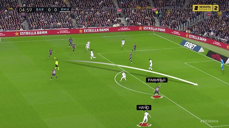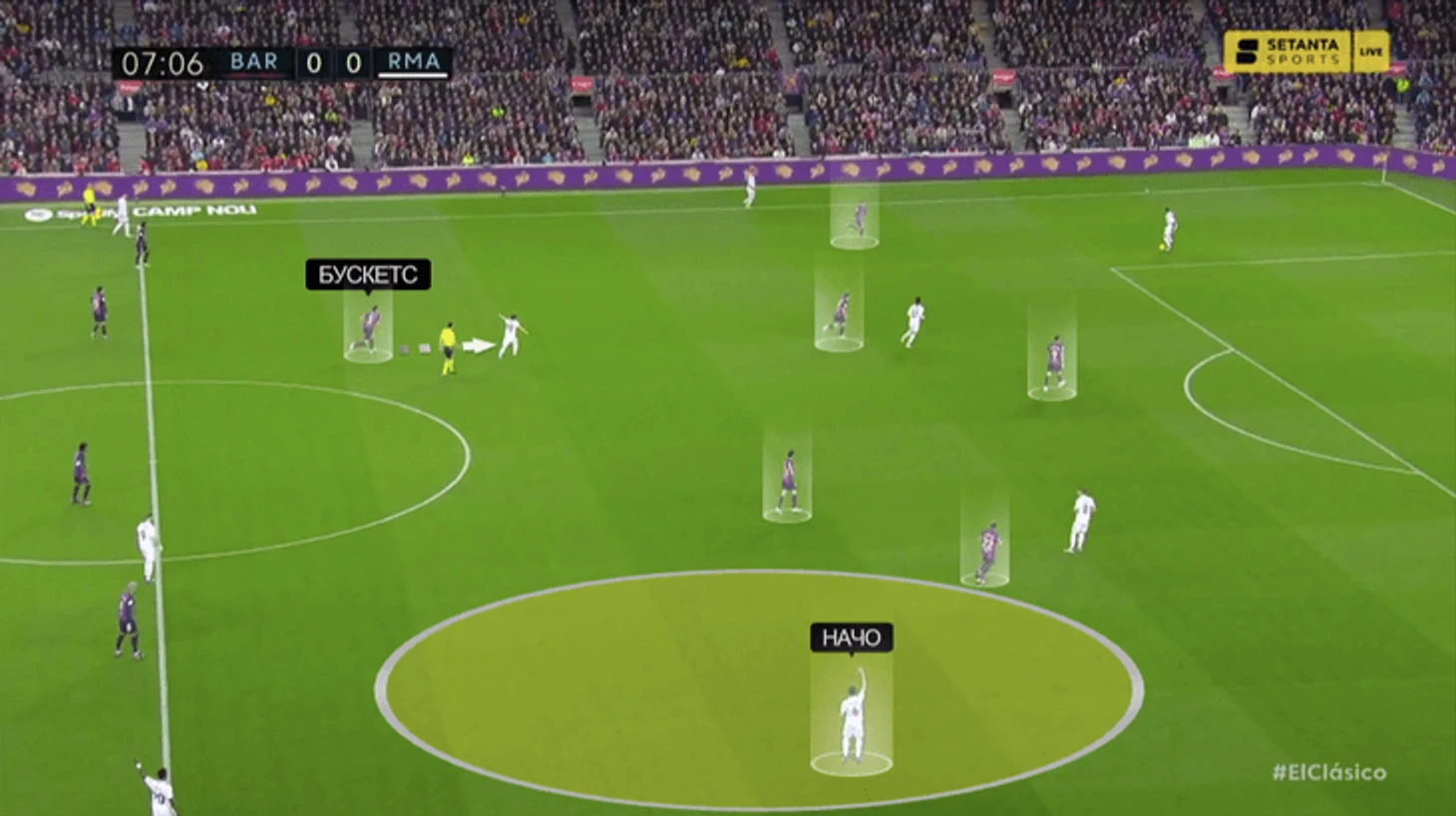 В воскресном класико поведение «Барсы» изменилось. Во-первых, прессинг был более смелым и цельным – в давлении участвовала не только атакующая группа (поддерживал в том числе Бускетс). Во-вторых, если и оставляли какой-то фланг свободным, то только тот, за который отвечает у «Мадрида» Начо.