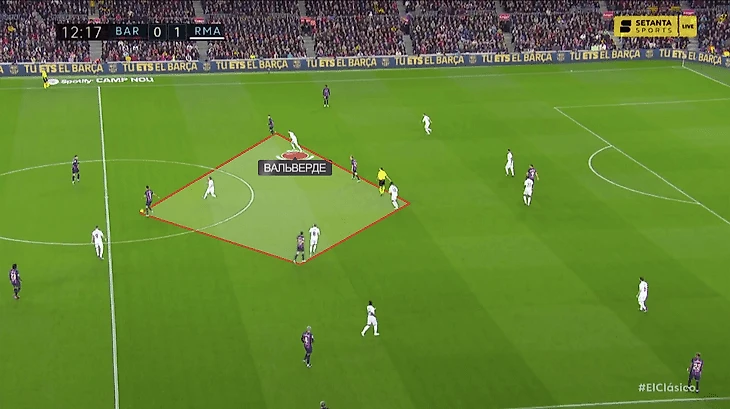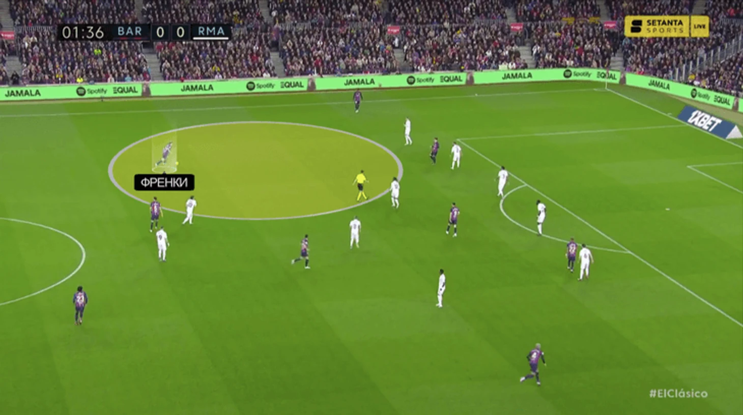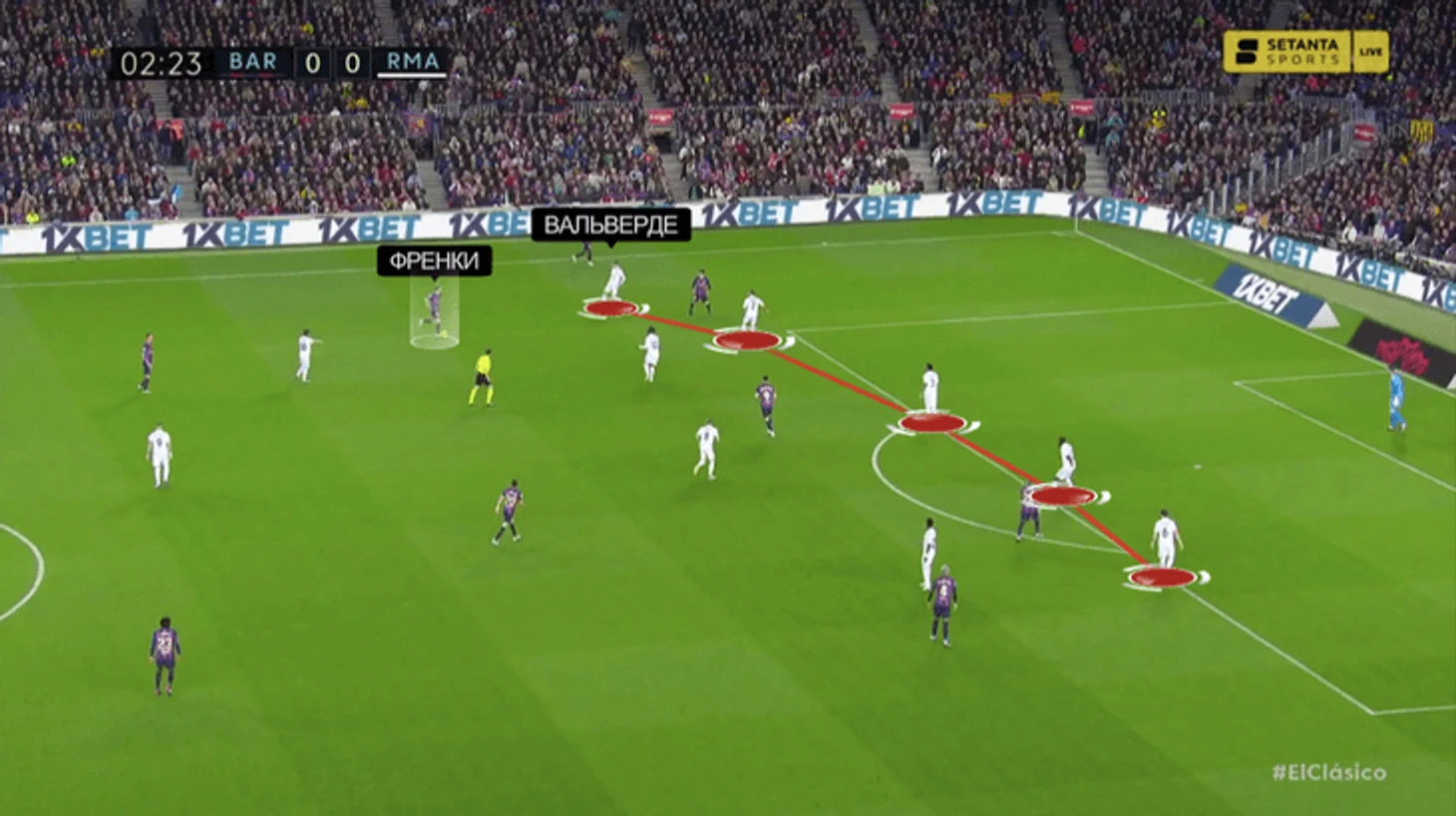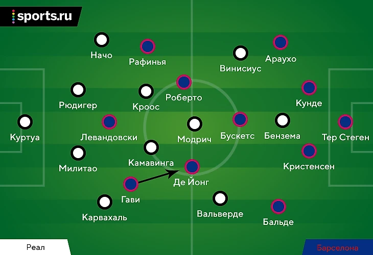Анчелотти быстро сориентировался. Важнейшее указание получил Феде Вальверде. Вместо того, чтобы опускаться дополнительным защитником (делал на старте игры), уругваец превратился в дополнительного хава – часто играл именно по Де Йонгу: