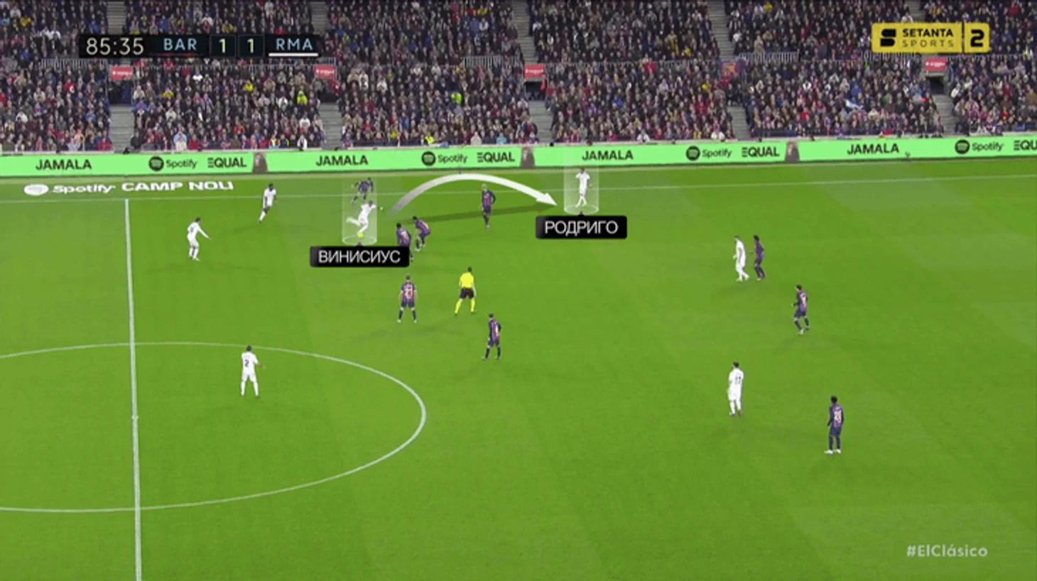 Ключевой ход на этом этапе – Родриго в роли вспомогательного вингера. Фактически бразилец дублировал Винисиуса и оказывался с ним в одной зоне – ближе к левому флангу «Мадрида». Это не новинка от Анчелотти – в похожей манере Родриго действует, когда подменяет Карима Бензема в нападении.