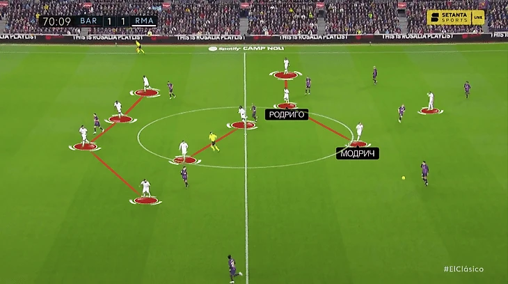 Первой порцией сменил Начо и Крооса на Менди и Родриго. В схеме «Мадрида» появился дополнительный атакующий игрок и просто более атакующий защитник. Лука Модрич на этом отрезке сместился на правый край: