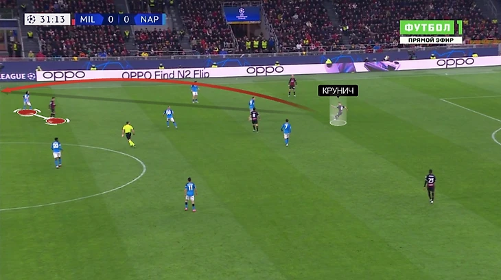 Как правило, хозяева давали длину, реагируя на выдвижения защитников «Наполи» – отправляли пас за спину тому игроку, который у гостей выдернулся из линии. Тут на Диаса вышел Марио Руй – Раде Крунич отправляет заброс в зону, которую оставил португалец: