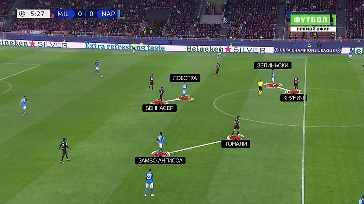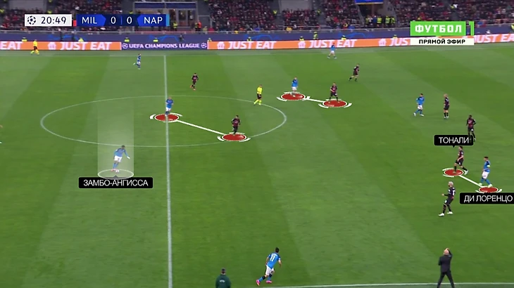 Из-за высокой позиции Ди Лоренцо полузащитники «Милана» путались и переставали поддерживать персональные ориентировки. Тут Тонали погнался за капитаном «Наполи» и оставил Замбо-Ангисса без опеки: