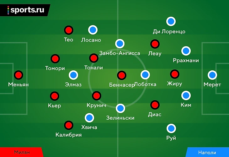 «Наполи» построил игру через высокие позиции Ди Лоренцо и Замбо-Ангисса. «Милан» ответил контратаками из их зоны