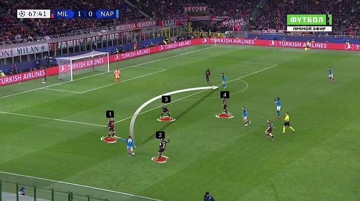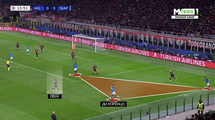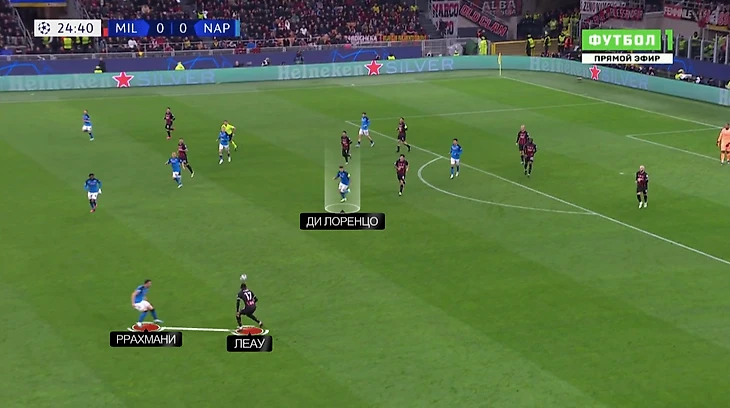 Вторая часть проблем – высокая позиция Ди Лоренцо. Тут Джованни застревает впереди, «Милан» наказывает пасом на Рафу Леау. Далее португалец разгонит контратаку, не заметив Ррахмани и все того же Замбо-Ангисса: