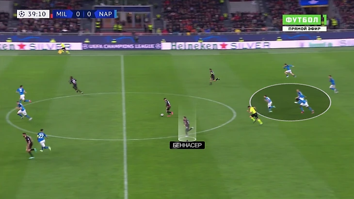Второй аспект, на котором «Наполи» добыл стартовое преимущество, – комбинации на правом краю. Это стало ответом Спаллетти на персоналки «Милана» в полузащите. Пиоли сохранил ее и на этот матч: Беннасер все так же контролировал Лоботку, Крунич присматривал за Зелиньским, а Тонали действовал по Замбо-Ангисса.