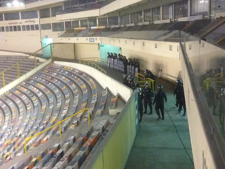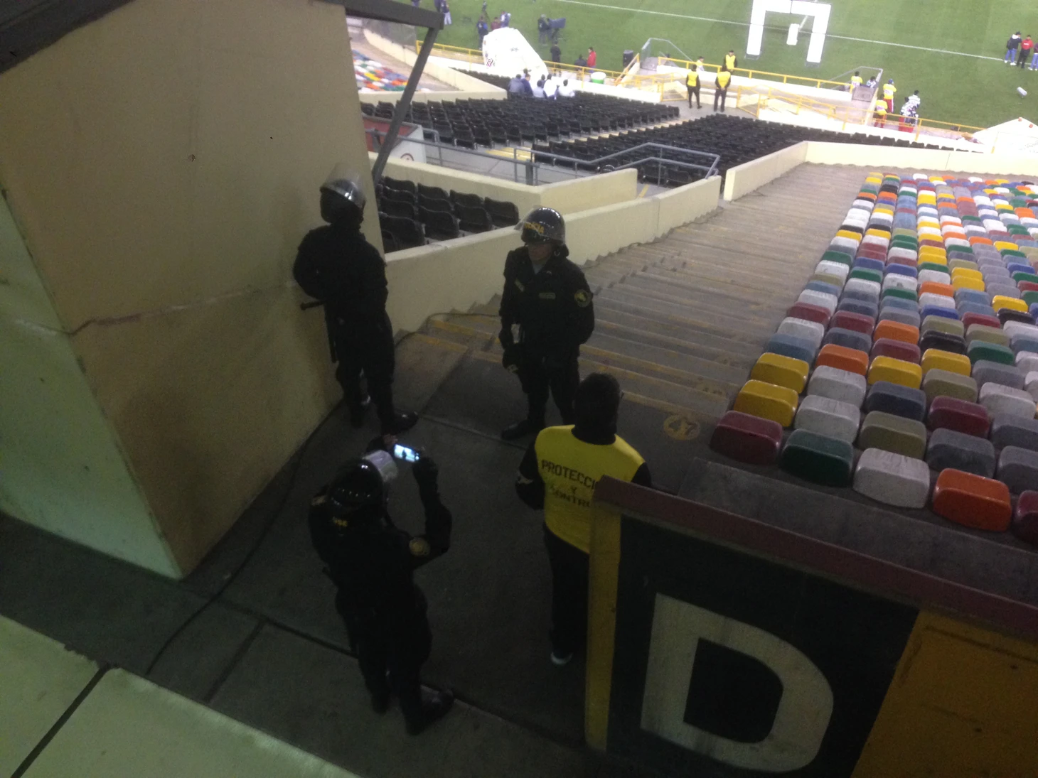Несмотря на то, что болельщиков на матч не пустили, на стадионе было много полицейских. Ситуация выглядела несколько абсурдно. Ещё во время Панамериканских игр я почувствовал, что спортивные соревнования в Перу проводят не для болельщиков. Знакомые ощущения, правда? За неимением работы, сотрудники полиции фотографировали друг друга и просто смотрели футбол.