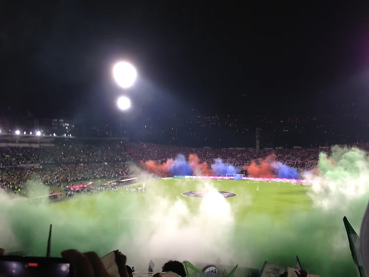 Во время выхода команд на поле я успел сделать только одну фотографию – дальше всё заволокло дымом файеров, а болельщики подняли небольшие куски пластика зелёного или белого цвета. Это традиция клуба «Насьональ». Перед каждым матчем по всему стадиону в определённом порядке у сидений раскладывают данные куски пластика. Их поднимают перед началом матча, и получается красивый общий перформанс. В это же время над стадионом поднялся гул из множества совместных звуков: болельщики обеих клубов продолжали петь, за пределами стадиона запускали салют, а команды слушали гимн Колумбии.