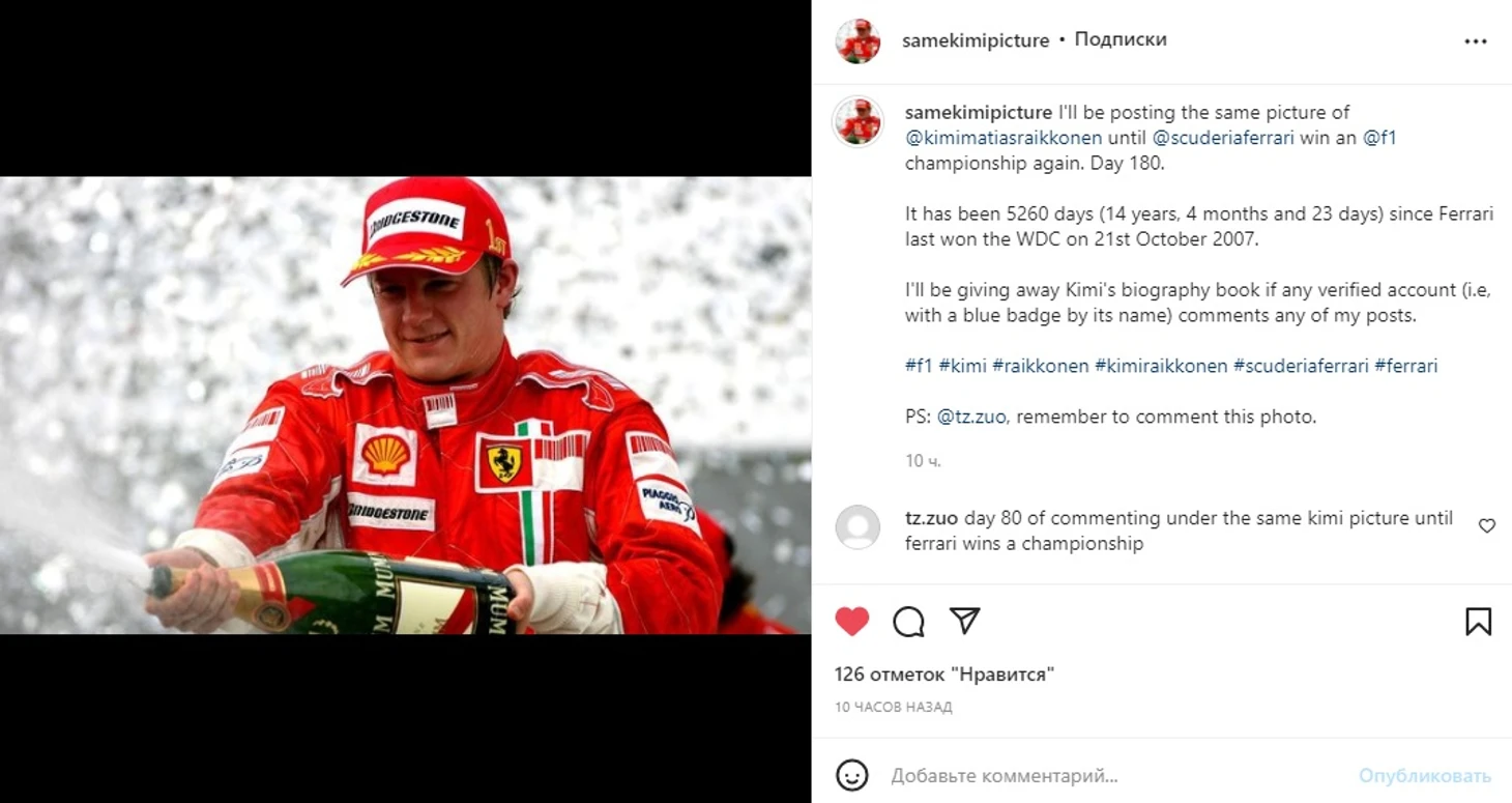 «Я буду публиковать одну и ту же фотографию Кими Райкконена до тех пор, пока «Феррари» не выиграет чемпионат «Формулы-1».