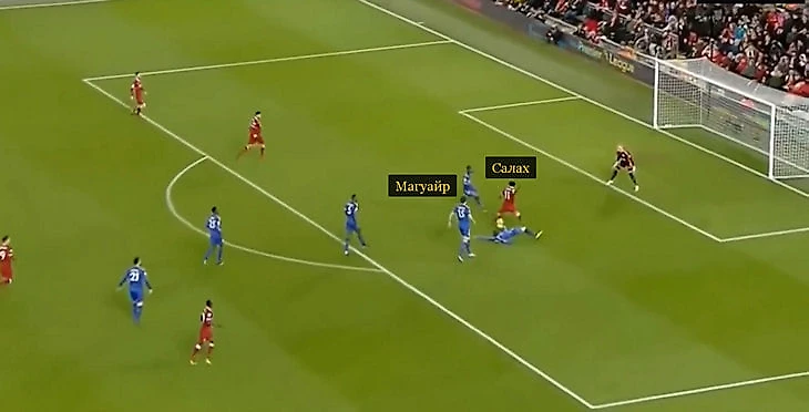 Салах получает мяч на границе штрафной, рядом с ним – Магуайр. В итоге англичанин просто выключится из эпизода, не станет даже пытаться отобрать мяч у египтянина и простоит на месте практически до конца.