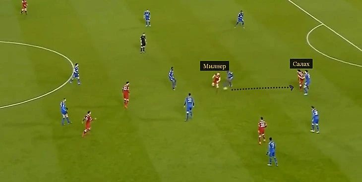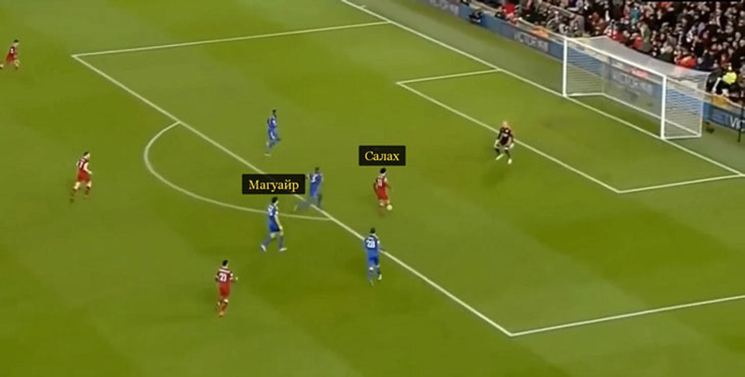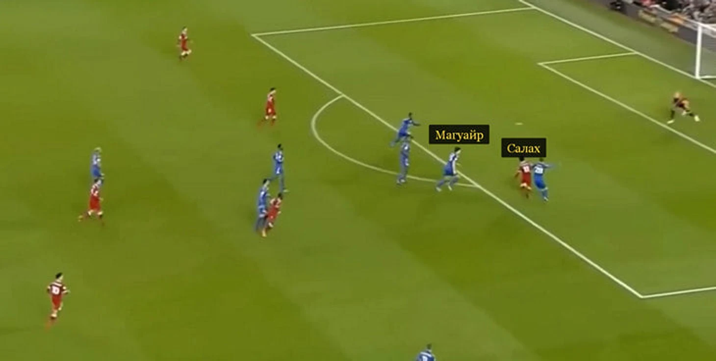 Между двумя скринами – полторы секунды. За это время юркий Салах успеет получить мяч, обойти неповоротливого Магуайра и войти в штрафную с мячом. Магуайр за это время лишь развернулся – в кадре видно, как он остался практически на том же самом куске газона, на котором и был в момент, когда Милнер принимал мяч. Еще через две секунды Салах отправится праздновать забитый мяч, а Магуайр продолжит находиться все на том же квадранте поля.