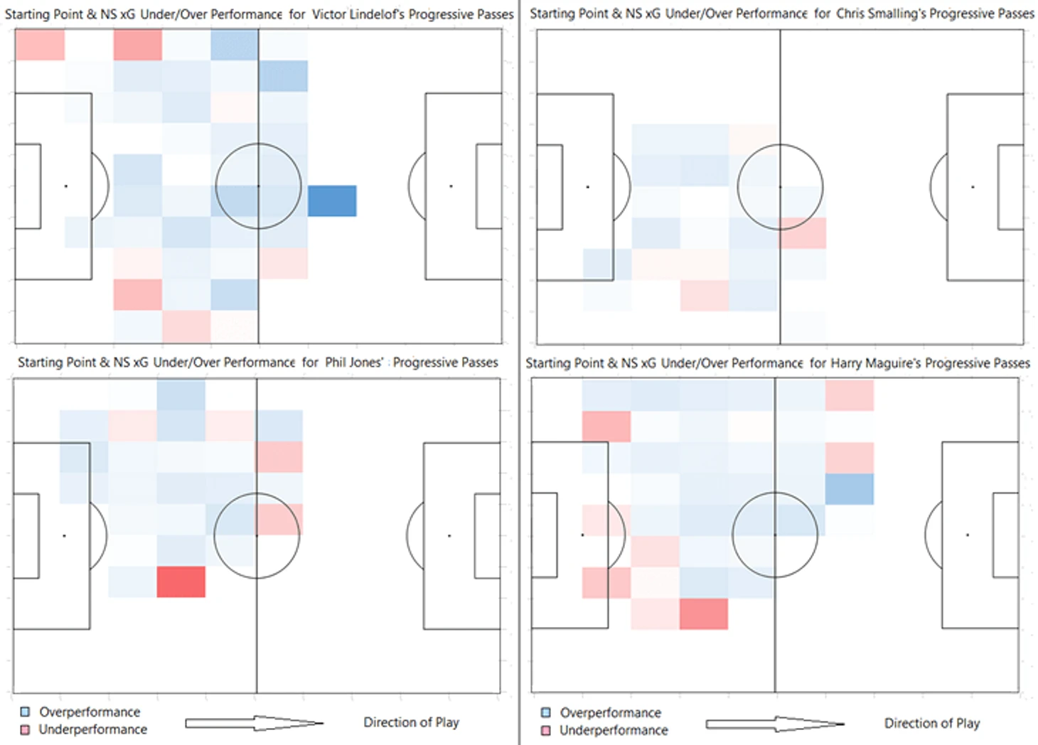 Карты прогрессивных передач вперед от защитников «МЮ» и Магуайра. Синим – более эффективные пасы, красным – менее эффективные. В верхнем ряду карты Линделофа и Смоллинга, в нижнем – Джонса и Магуайра.