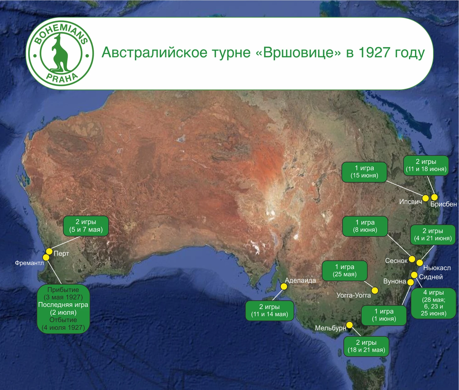 Первый матч в Мельбурне «Богемианс» сыграл против сборной штата Виктория, и это была довольно сложная игра. Накопившаяся усталость, довольно крепкий соперник, судья, откровенно поддерживающий хозяев, сомнительный пенальти в ворота европейской команды, целых 6 минут добавленного времени – все было против чехов, но они сумели победить со счетом 1:0. Европейский футбол был (и, вероятно остается) не так популярен, как крикет, поэтому на матч «Богемианса» пришло лишь около 10 тысяч человек.