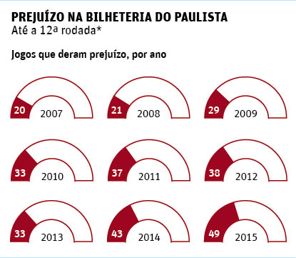 С посещаемостью падает и доход клубов, так в Паулистао в этом году убыточным оказалась практически половина проведённых матчей. И количество таких игр стабильно увеличивается каждый год (цифры по итогам 12 туров):
