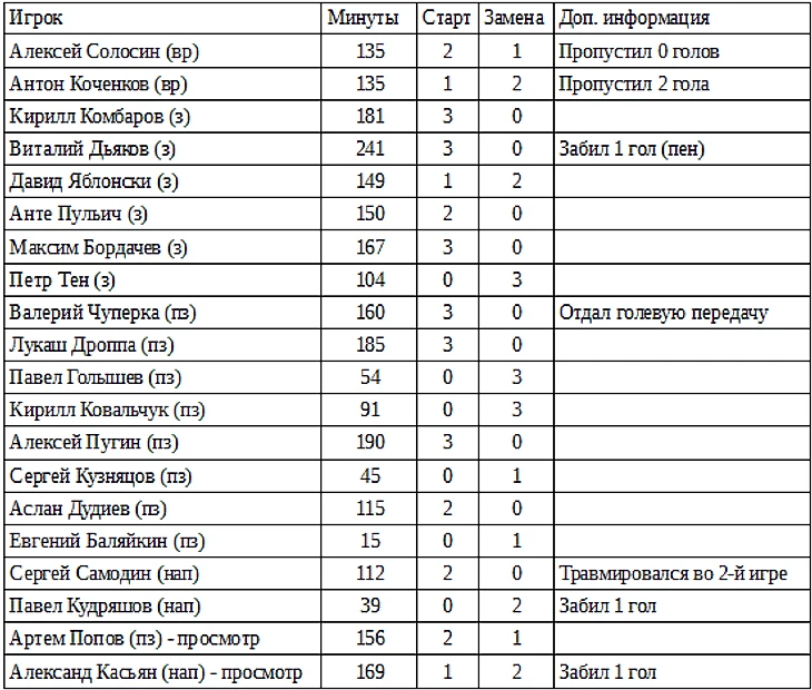 Мы видим, что твердыми игроками основы у Валерия Петракова были Кирилл Комбаров, Виталий Дьяков, Максим Бордачев, Валерий Чуперка, Лукаш Дроппа и Антон Пугин. Двое из них (+Кузняцов) являются кандидатами на капитанскую повязку. Также на просмотре был еще один футболист, который сумел за 75 минут отличится одной голевой передачей.