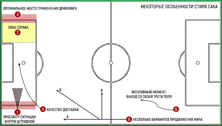 Особенности стиля Сака: дриблинг в важных точках, игра на непривычном фланге, использование правой ноги