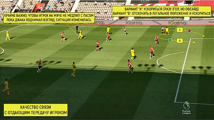 Ситуация также скорее из репертуара центральных форвардов, но оказываясь в первой линии атаки, полезно активнее расширять арсенал. Быстрая работа ног – скорее явный плюс Букайо, но в эпизоде выше более искушенный игрок сначала заскочил бы в легальное положение, а затем сделал обратное ускорение. Сака не стал себя утруждать, рванул сразу и даже отдал голевой пас. Офсайд обнулил его усилия. Нельзя снимать ответственность и с Джаки: одинаково видеть один и тот же момент с разных ракурсов, играть синхронно – источник силы больших команд.
