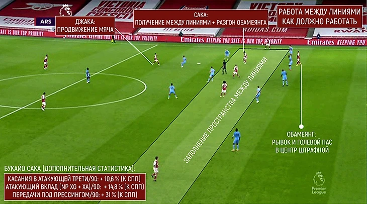 Пока прогресс в этом аспекте не приводит к повышению результативности команды, но сама динамика интересна. Сака обладает достойной подачей, но это больше репертуар крайнего защитника. На фланге атаки Букайо скорее нацелен на прострелы и навесы на неудобной высоте.