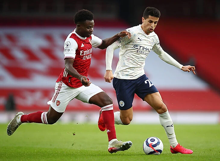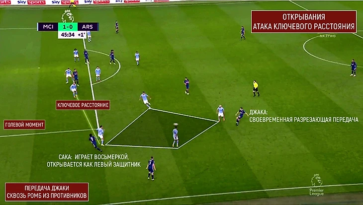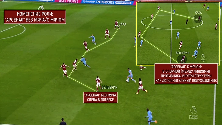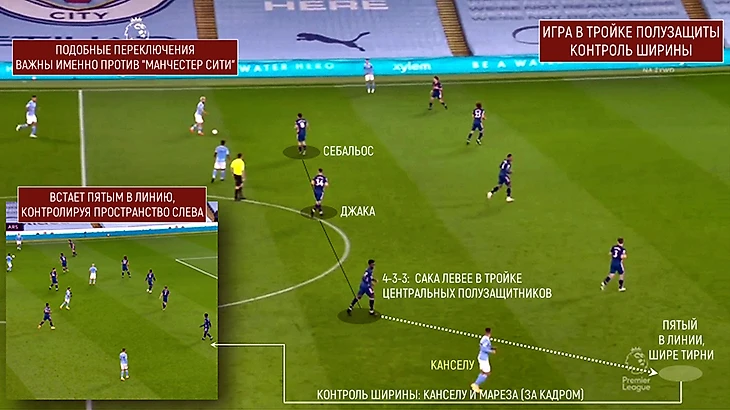 Хорошо видны эти позиции-близнецы Сака и Канселу в матче команд Артеты и Гвардиолы. Букайо должен не только следить за Канселу, но и не забывать, что португалец и Марез могут перегрузить Тирни, расширять фронт обороняемого пространства, линию обороны при мяче на другом фланге.