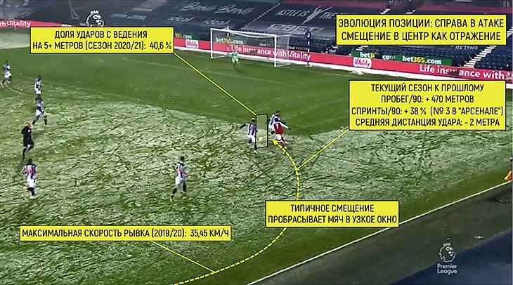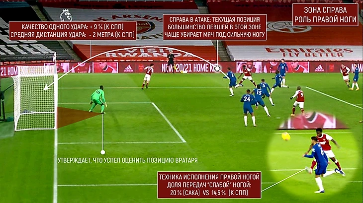 При игре на правом фланге атаки Букайо чуть более заточен на самостоятельное завершение ситуаций. Этому способствует и грамотный поиск позиции. Средняя дистанция удара Сака на 2 метра короче, чем у игроков его позиции (этот показатель лучше, чем у 73% выборки игроков фланга атаки).