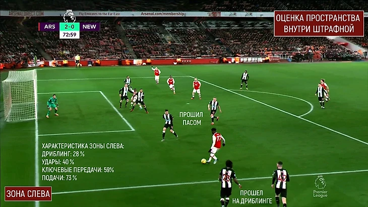 1. Отличное качество – оценка ситуации внутри штрафной соперника при расположении на фланге. Это позволяет Сака выбрать оптимальный вариант доставки: низом во второй темп, прострел во вратарскую, мягкий навес на дальнюю штангу, продолжение движения.