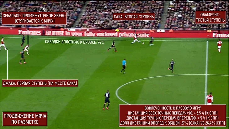 «Арсенал» создает трехэтажную систему вывода мяча: Джака опускается на место Букайо (левого защитника), доводит мяч до Сака, который поднимает мяч еще дальше, под рывок Обамеянга. Роль Себальоса – вспомогательная, движение под передачу, он дает +1 вариант.