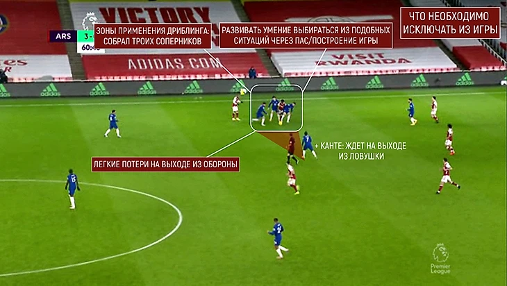 Это не единичная история, поэтому в аналогичных ситуациях Сака должен быть более осторожен и рационален: опираться на умение выходить из насыщенных зон через аккуратный пас, иногда в одно касание. Дешевые потери в дорогих зонах – не лучший способ проявить себя. Играя левого защитника, Букайо мог больше навредить команде именно через собственные потери, а не потому, что соперник грамотно вскрывал его зону. Ну и дриблинг не может быть универсальным ответом на все возникающие трудные ситуации.