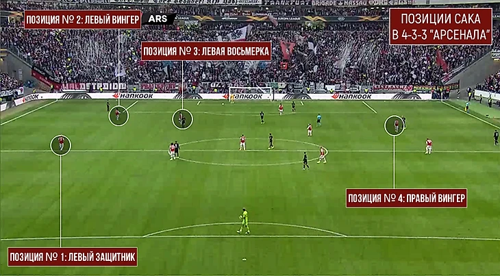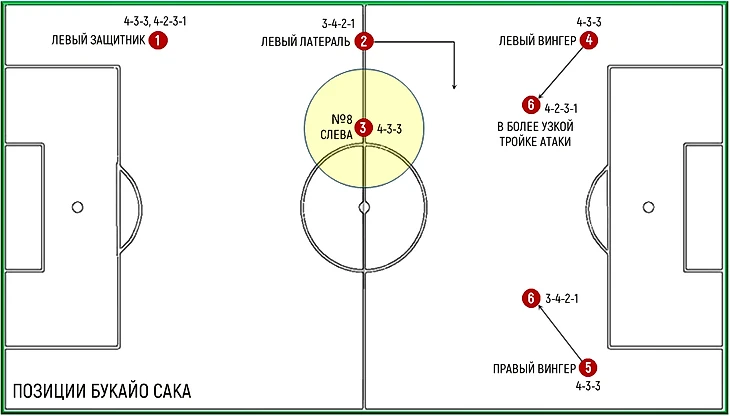Интересная картина: постепенно Сака пересек все поле по диагонали – от левого защитника до правого вингера. Немного напоминает видеоигру, где нужно проходить один уровень за другим. Чтобы разобраться, начнем с одной из базовых расстановок – 4-3-3: