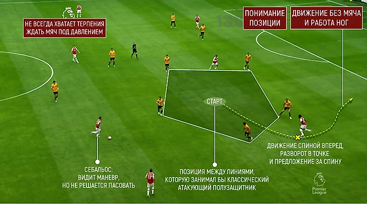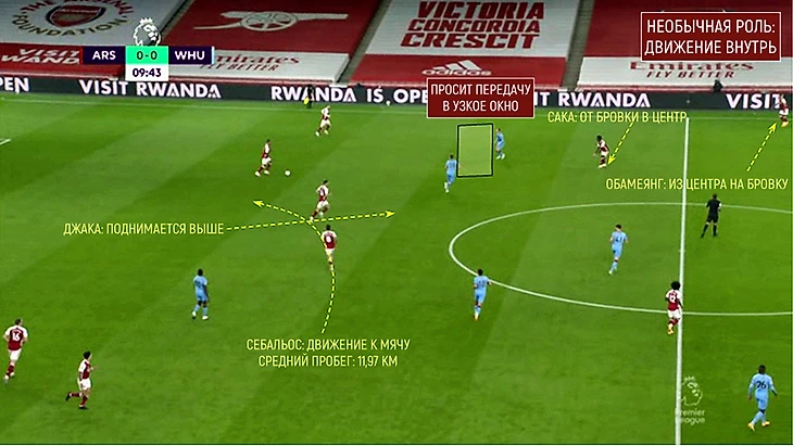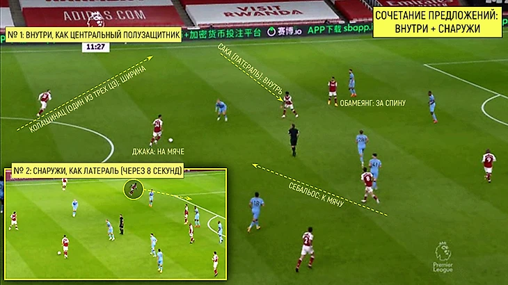 Сака идет внутрь и просит мяч в ноги жестом, Обамеянг занимает бровку, Себальос стягивается к мячу, набирая подобным движением под партнеров километры пробега. Формально Сака здесь – левый латераль, но в конкретном эпизоде важнее навыки центрального полузащитника (прием за первой линией прессинга).