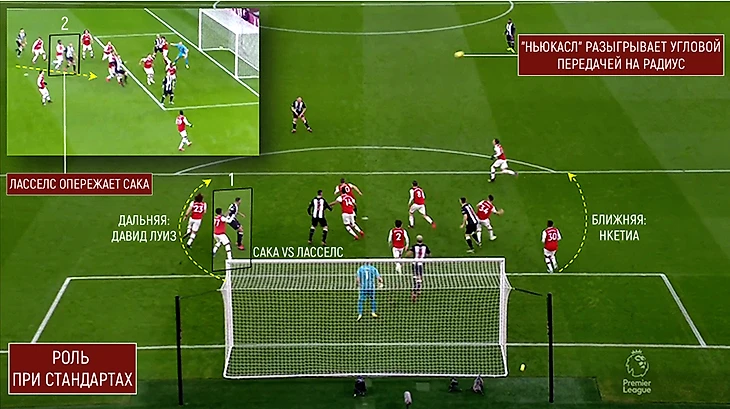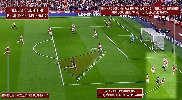 Обратите внимание, насколько медленно перемещается вся линия обороны «канониров» после подачи, Сака против Лазаро из «Ньюкасла» страхуют не центральные защитники, вернувшиеся с края штрафной в створ (на самый опасный участок), а Обамеянг, добегающий эпизод из глубины. Вся линия медленно восстанавливает позиции, запаздывает со страховкой, а сам Букайо действует недостаточно агрессивно – слабости обороны хорошо видны.