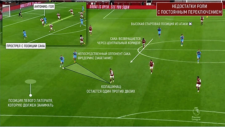 Сака стартует из очень высокой позиции, возвращается через центр, позиция в линии пустует, прямо на нее накатывает быстрая атака, в которой, выражаясь шахматной терминологией, «Вест Хэму» нужно лишь грамотно реализовать лишнюю пешку. Колашинац остается 1 в 2 против Боуэна и Фредерикса, прострел с номинальной позиции Букайо, 1:1.