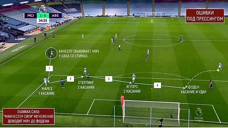 Помарка Сака конвертируется в опаснейший момент почти автоматически: мяч доставляется Фодену кратчайшим путем. Нити выхода вперед активно обрываются, владение на текущем отрезке – 86 на 14% в пользу «Манчестера». Если ты достаточно смел, чтобы выстраивать поэтапное владение от вратаря, разыгрывать коротко и под давлением, команда Гвардиолы – лучший тест такой системы. Но и за ошибки она наказывает стремительно.